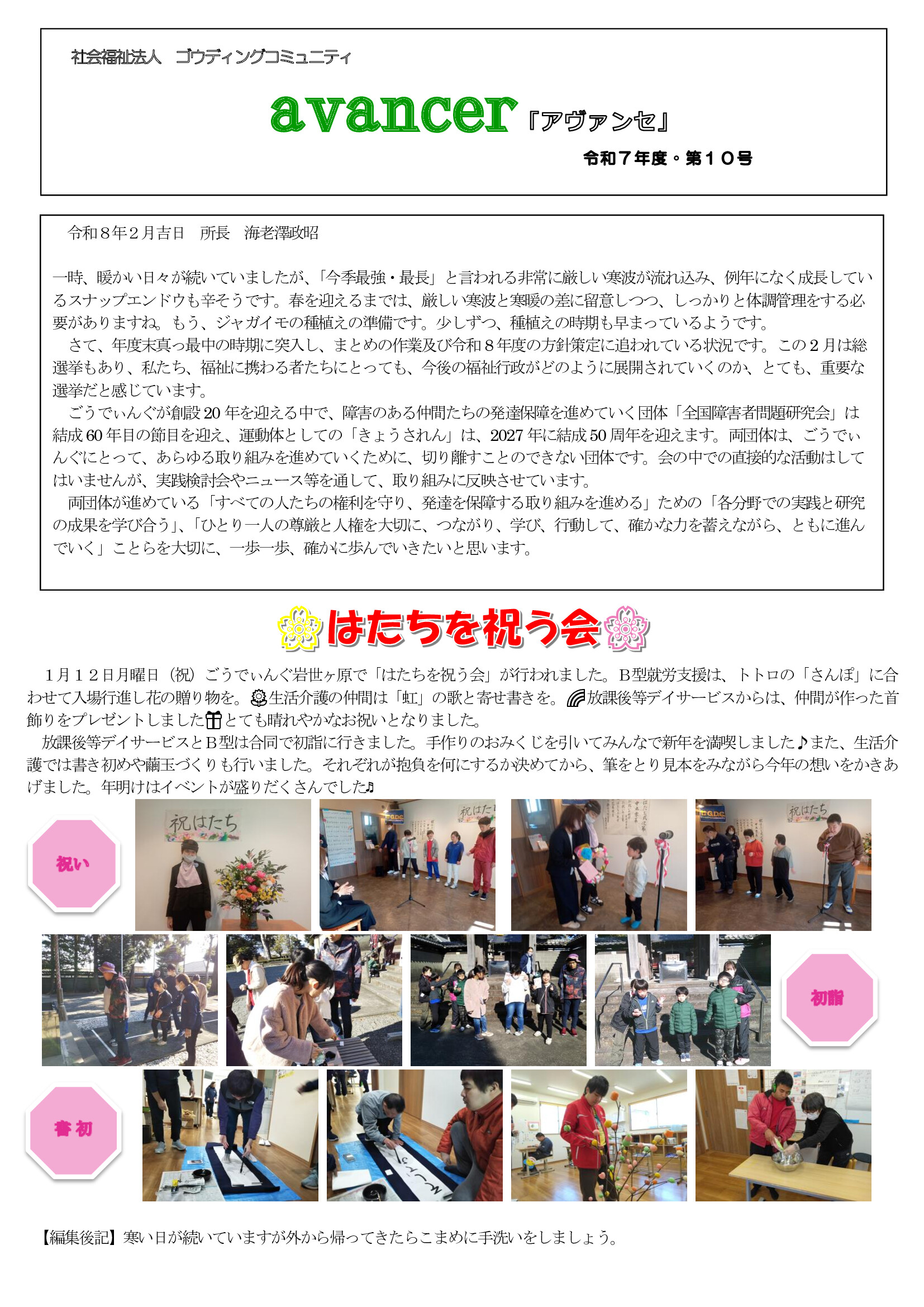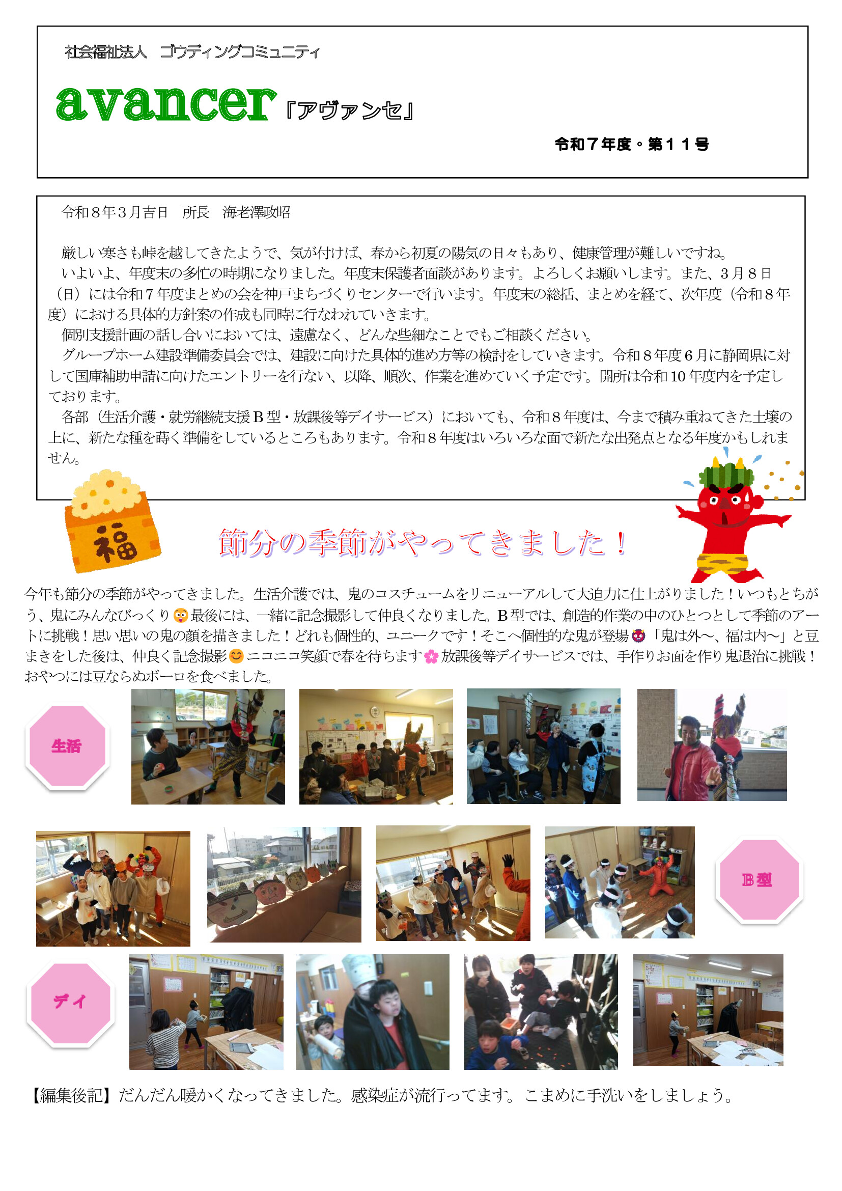 一か月の振り返りとしてごうでぃんぐ所長からのコメントと、広報より各事業部の行事やお知らせなどを掲載しています。”アヴァンセ”はフランス語で”前進する”、そんな想いを込めて名付けられました。毎月発行していますのでぜひご覧ください。