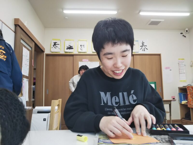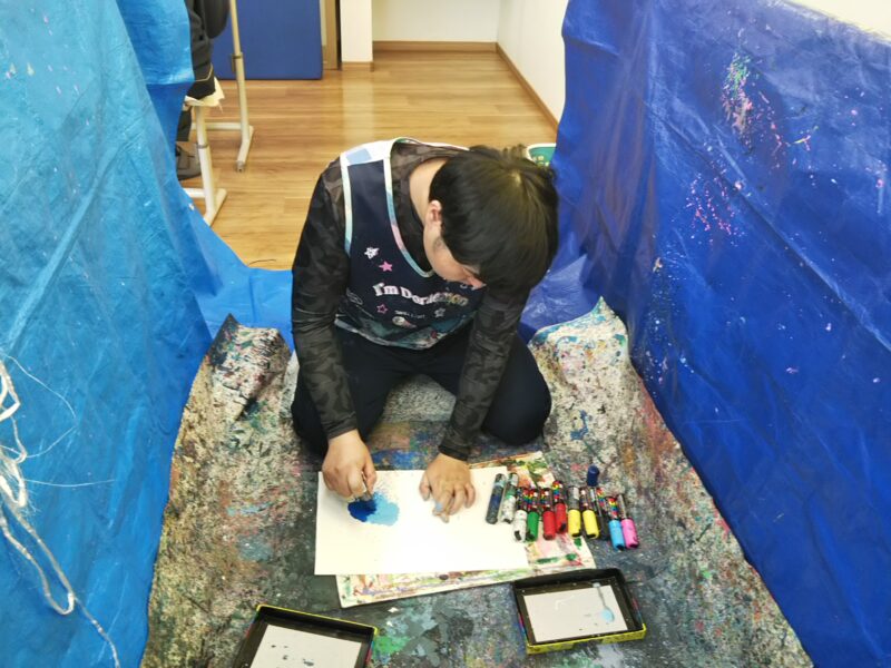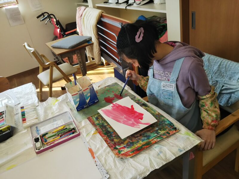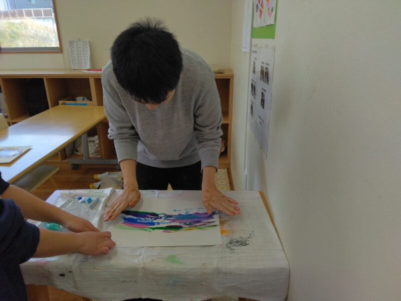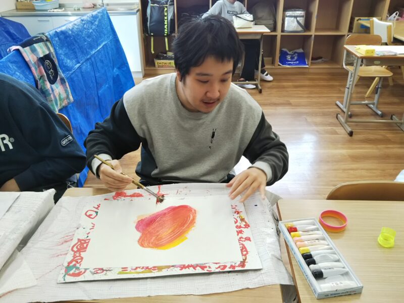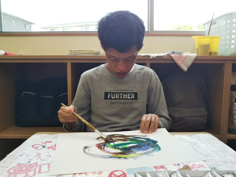 アートディレクターの山下先生を中心にゆったりとした時間の中、仲間達は思い思いの作品を仕上げます🎨繊細な作品や、ダイナミックな作品を仕上げる仲間達。その日の感情が爆発することも!同じ作品ができることはありません。支援員たちは仲間たちを急かすことなく、しっかりと待ちながら見守ります☺そして1つ1つ作品が仕上がるごとに新たな作品に出合えた喜びで歓声が上がります✨支援員もとても楽しみにしている時間です🖼